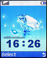 Sound settings. Here you can choose a ringing tone (totally, 44 polyphonic melodies and animals voices). The phone supports 40-tones polyphony and a ring is very loud. There are several types of incoming alert: just sound, just vibrating alert and a mixed mode (firstly, vibrating alert and then a sound). One of 10 pre-installed tones can be chosen for SMS messages. You can also switch a minute minder, which works in a talking mode and set a tone that is played while connecting with the other side (subscriber). Phone settings. All settings are ordinary. However, you can adjust contrast of both screens (external and internal). And you can choose one of the animated pictures here. After it you will feel all capabilities of the screen. ![]()