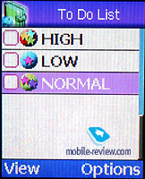 To-do list. You can add notes concerning your business, set a priority level (high, low, usual) and copy these notes to a calendar. Date and time. You can view a world time in cities and set current local time and date. Alarm-clock. There are two alarm-clocks here: recurrent and the one, which can ring only once. Both alarm-clocks can work when the phone is switched off. Calculator and currency converter are simple but they make their job. Network Service. Apart from usual network settings the phone allows a user to choose manually a current band (GSM900/1800 or GSM1900). Funbox. Up to 3 games are pre-installed, they are X-Fighter, SpaceWar, MyPet. All of them were in other phones from Samsung. ![]()