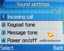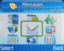 That sounds rather strange, but there is no a strap hole in the phone. The handset is supposed to always rest in your pocket or a bag. To tell the truth, the model is mainly targeted at men, women are unlikely to find it nice. The left side features a coupled volume button, and a camera one is on the right side, as well as a charger connector, which allows plugging a headset as well. The connector type is similar to the latest Samsung's models. And a 1.3 MP camera module and a flash are on the back. The module is equal to the majority of Samsung's products, no peculiarities. MenuThe organization of the menu is identical to that of other Samsung's phones except for the screen orientation and a corresponding interface tuning for this peculiarity. The main menu is represented only in one view that is a row of icons. Number navigation using number series is supported. All the submenus are lists and shifting between the submenus is possible by pressing the left or right on the navi pad. You can assign personal functions chosen from the list to the navi button. In general the menu division is quite logical and navigation is not a problem.