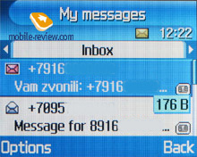 Messages. Working with different types of messages is done through separate submenus. Let us begin with short messages. Up to 200 messages can be saved in the phone's memory; the phone supports the EMS standard compatible with Nokia Smart Messaging. T9 functions very well and is quick and easy to use.