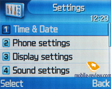 Settings. That is traditional that you are allowed to choose font colour in the standby mode, protect any section of the phone with a password (messages, short messages, organizer and so on). You may set the time for backlighting on and its brightness.