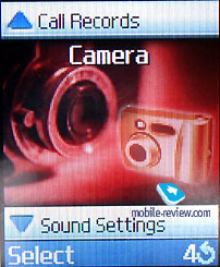 Call lists. Everything is traditional here, here are lists of missed, received and dialed calls with date and time, up to 20 records can be stored in each list. There's no general time in call counters, but you can see separately the time of all dialed and the time of all accepted calls. Camera. In this model the chamber precisely same, as well as in model V200, differences are not present. We shall remind the basic functions of the chamber. Phone display is used as a viewfinder, you can rotate an image 180 degrees using side keys. Other manufacturers don’t have such feature. You can adjust brightness of the picture pressing navigation key. Also there is a Zoom-function in the phone, it is quite acceptable. To make a shot, press a special key under the screen. Then you can save this photo or delete it. All photos can be viewed in Photo Album, some photos are presented as small copies. Navigation is simple and convenient.