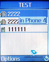 Phonebook.You can save up to 1000 entries in the device, it can be phone numbers or e-mail addresses. For one name you can enter as many phone numbers, as you need. In the list are displayed numbers, from memory of the device, and from the SIM-card. You can create up to 10 groups of subscribers, it is possible to choose ringtone, melody or tone for SMS-message for each group. You can assign up to 8 fast dial numbers. As a whole all the functions of the phonebook are standard, it's impossible to correlate photo with subscriber's name. ![]()