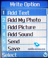 Picture Messages. As against other devices from Samsung the realization of sending and reception of MMS-messages is made on qualitative other level in this device. The first and the main change is that now you are capable to create some pages in one message, containing sound, graphics, text, you can adjust the interval between displaying of separate pages. 700 KB of the memory are allocated for MMS-messages. ![]()