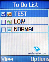 Organizer. The calendar shows the current month, you can enable reminder for separate days (up to 40 symbols). There is no division into various events, as against V200 it is possible to enter several events for one day. When viewing separate day, the amount of records for it is not shown, it's more likely a minus of the device. ![]()
