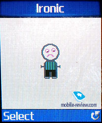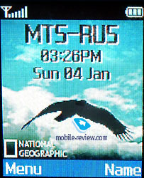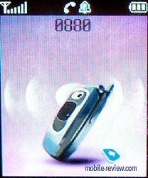 Only half of the screen is used in stand by mode. This is text line with main icons and the time. The user can also define date or analogue clock being displayed. The last two have really nice animated effect and were made with taste. . The manufacturer once again claims that the external display can show up to 256 colors, but this specification is more theoretical. In reality it will be almost impossible to see more than 4 colors displayed on the screen at once. First of all its soft-blue, the second will be time – green plus additional icons – red (for example – overfill of SMS-memory). You can consider picture’s quality as another proof, well more like the number of displayed colors on the picture from built-in camera. You will not see anything more than just shades of one color, make the conclusions yourself. Soon manufacturers will come to the conclusion that marketing needs are not so high and will start mentioning the real number of displayed colors by OLED-displays. The first example can be mentioned - Philips who announced Philips 639 with PolyLED display that can show only one color (trademark of OLED-screen with mirror surface).