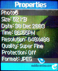 The thumbnails can be viewed from the photo album. As to the pictures transfer to PC, it can be done via special software that is not yet available. Besides taking pictures you have the ability to record short video clips (30 seconds, w/o sound, Motion JPEG). The video clips share the same memory, as the pictures do. However I didn’t manage to transfer the clips to PC, since there is no required software around, and direct transfer via IrDA is not supported (the same thing goes with photos). Video clip’s quality is nice, and it suits perfectly as an additional function. Although the picture remains rather shaky.