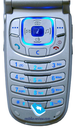 Keyboard section is made in traditional way. Keypad is formed in horizontal rows, their size is average and the buttons are convenient. The navigational key is four-positional and it has button for WAP access placed inside. However the OK button would seem more fit in this situation (this time its role is played by the right soft key, or the navigational key pressed right). The keyboard’s backlight is blue, central row is lightened the most, side keys are darker. The backlight is not seen well in all conditions. Indoors with good lighting conditions will result symbols being hardly readable.