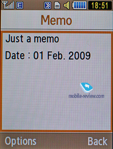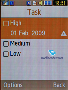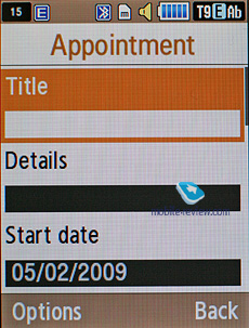 ОрганайзерВ памяти телефона можно сохранить до 500 событий, они различны, это встреча, годовщина, праздники, важное, а также личное. Для каждой записи устанавливается время и дата события и указывается время его окончания. Можно выставить сигнал и интервал, за который он сработает, есть повторяемые события (причем настраивается время повтора, указываются исключения, это удобно). Просмотр календаря за месяц и неделю реализован удобно, каждый тип событий имеет свой цвет, все наглядно. К серьезным недостаткам органайзера относится тот факт, что при вводе даты и времени события время окончания остается установленным по умолчанию. У других производителей эти параметры меняются автоматически (по умолчанию дело занимает один час времени). Эргономика органайзера из-за этого серьезно страдает.