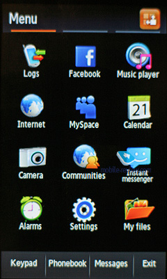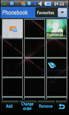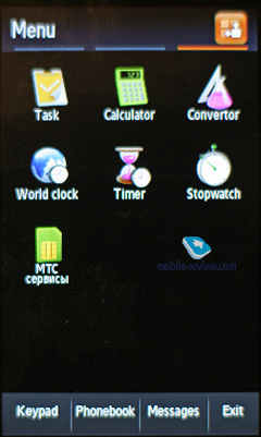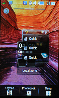 В российской версии присутствуют также локальные виджеты. В главное меню можно попасть, нажав на иконку в нижней части экрана, либо из меню быстрого доступа, назначенного на центральную клавишу, принципиальной разницы нет. Из режима ожидания также можно вызвать цифровую клавиатуру для набора номера, все очень просто. Главное меню представлено матрицей 3х4. Работа с сенсорным экраном проста. Вы нажимаете на нужный вам пункт, и он оказывается выбранным, поле для ввода информации – двойное нажатие, первым выбираете поле, вторым вызываете клавиатуру.