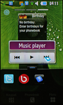 Меню, интерфейсМодель типична для текущего поколения сенсорных телефонов от Samsung. Давайте поговорим обо всех возможностях телефона по порядку. В режиме ожидания на экране отображается нижняя линейка с тремя ярлыками, это доступ к набору номера, контактам и меню. Доступ к виджетам разместили в верхней части экрана (значок шестеренки, сама линейка, теперь появляется внизу). Открыв линейку, вы можете перетаскивать на экран любые из приложений Widget’а. Их расположение на экране задается вами, аппарат запоминает его. Понятно, что стоит проявить вкус и не создавать нагромождения из разных окошек, а ограничить себя несколькими. Давайте посмотрим, какие функции могут быть на главном экране: