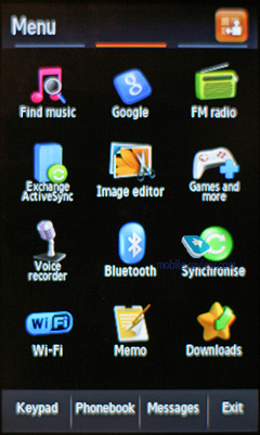 Ввод информации осуществляется с экранной клавиатуры, которая максимально похожа на обычную клавиатуру телефонов. Изображены кнопки, на каждой нанесено несколько символов. Чтобы выбрать нужную букву, вам приходится нажимать несколько раз на клавишу. ![]() В аппарате отсутствует экранная QWERTY-клавиатура. Присутствует режим предиктивного ввода текста Т9. Во время ввода можно переключаться на любой из предустановленных языков, с этим нет никаких проблем. Из меню можно вызвать режим редактирования текста, тогда его можно будет выделить, но не скопировать куда-либо. Выделение пригодится, если вы решите в сообщении сделать другим шрифт или проделать что-то подобное. Во всех меню присутствует нижняя линейка, в ней клавиши сделаны контекстными, то есть их значение и количество (максимум три, в центральном меню четыре – добавилась кнопка выход) меняются в зависимости от текущего меню. Во всех меню, где возможен выбор из нескольких элементов, они представлены горизонтальными линейками, которые можно убрать с экрана. Крайне удобное представление, оно есть как в сообщениях, так и в плеере. К плюсам списков также относится возможность вызвать на экран дополнительные инструментальные панели. При просмотре фотографий, например, в такой панели выводятся миниатюры соседних файлов, их можно выбрать в одно касание. При наборе сообщения это могут быть дополнительные панели с теми или иными функциями, они прячутся за экраном, но их можно вызвать в одно касание. Это приятно. Если проводить слева от экрана, то прокрутка списка будет быстрее, нежели справа. Мелочь, а улучшает функциональность решения в несколько раз, делает его удобнее. Традиционно есть три рабочих стола, плюс четыре вида (страницы) в главном меню. Иконки в главном меню можно настроить и отсортировать по своему усмотрению. Аппарат поддерживает многозадачность, открытые приложения отображаются в главном меню кружочками. Переключение между приложениями осуществляется удержанием центральной клавиши, появляется трехмерное меню с иконками страниц и приложений. Отображение этого меню можно изменить на обычное, тогда иконки расположатся в виде матрицы.