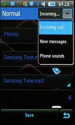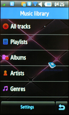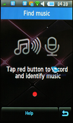 Во время проигрывания показывается номер текущей песни, общее число композиций. Эквалайзер есть, но нет никакой возможности для его настройки. Проигрывание может идти как через стереогарнитуру, так и через громкую связь. Громкость имеет 14 градаций. Пользователь может создавать свои плей-листы. Плеер работает и в фоновом режиме. В этом случае на экране отображается название композиции и подсказка к управляющим элементам, что приятно. Для наушников предусмотрен режим 5.1, который создает объемное звучание. Поддерживается Album Arts. В режиме громкой связи динамик играет не очень чисто, не хватает мощности, но звук при этом средней громкости, он не слишком тихий. Присутствует опция Find Music, можно по отрезку мелодии найти название исполнителя и добавить мелодию в Wish List.