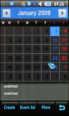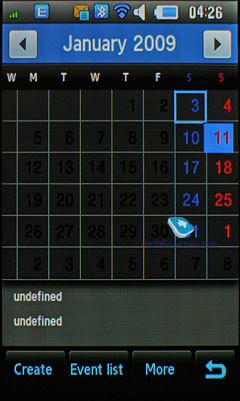 Встроенный почтовый клиент обычен, никаких особенностей у него нет. Всего можно настроить до 5 аккаунтов, ограничение на число сообщений для каждого равно 100. Поддерживаются вложения, но ограничение на размер сообщения при отправке – те же 500 Кб, для принимаемого сообщения ограничение 5 Мб. Получаемые файлы можно просматривать на устройстве с помощью встроенного браузера. Поддержки html в письмах нет, что вызывает нарушение форматирования большинства получаемых писем, просматривать их не слишком комфортно. Почтовый клиент в телефонах от Samsung начинает сильно проигрывать таковому в аппаратах от Nokia, Sony Ericsson. ОрганайзерВ памяти телефона можно сохранить до 500 событий, это только один тип события, плюс есть отдельно годовщины. Для каждой записи устанавливается время и дата события и указывается время его окончания. Можно выставить сигнал и интервал, за который он сработает, есть повторяемые события (причем настраивается время повтора, указываются исключения, это удобно). Просмотр календаря за месяц и неделю реализован удобно.