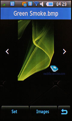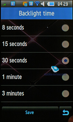 НастройкиТрадиционно можно защитить паролем любой раздел телефона. Указывается время подсветки экрана, его яркость. Каких-либо специальных или необычных настроек в телефоне нет. Есть набор из различных обоев, в том числе их случайная смена.