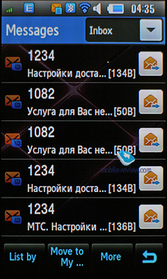 СообщенияАналогично другим производителям в Samsung отказались от искусственного разделения сообщений на SMS/MMS, вы создаете сообщение, и уже в зависимости от его содержимого оно трактуется как SMS либо MMS. В меню осталась опция, позволяющая в принудительном порядке переключить сообщение в MMS (например, вам нужно отправить только текст, но на электронную почту, минуя встроенный почтовый клиент). В памяти телефона может храниться до 500 сообщений, аппарат поддерживает стандарт EMS, совместим с Nokia Smart Messaging. При отправке можно выбрать имена как из телефонной книги, так и из списка последних использованных либо из групп. Выбирается SIM-карта в одно касание с экрана. Традиционно присутствует возможность ведения черного списка для всех видов сообщений, тогда любые сообщения с указанных номеров будут автоматически удаляться. Есть возможность переносить сообщения в свои папки. Плюс появилась опция сохранения архива всех сообщений на карте памяти. Для электронной почты блокировка возможна не только по адресу, но и по теме сообщения.