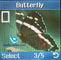 There is a special folder for drafts and own messages. Memory for storing photos and MMS-messages is shared dynamically. Total memory pool is about 9 Mb. It’s more than sufficient for the phone of this class. Call records. There are lists of 20 missed, 20 received and 20 dialed calls in the phone. Time and date of each call is indicated in this menu. You can also view time of the last call, total time of all incoming and outgoing calls. Sounds.The phone supports 40-tones polyphony, which sounds not bad. There are several modes of incoming alert, for example, only sound, only vibracall, and then a melody. Other settings are standard. You can select signal tone for SMS-messages, MMS-messages, adjust minute minder during the talk, select silent mode (only vibra). Settings. Apart from greeting messages, you can adjust display settings here. You can set animation (up to 5 pre-default ones) as a wallpaper. It is possible to select font style and location of text.