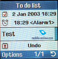 Duration of backlighting can be also different (from 15 seconds to 10 minutes). The longest value is interesting for those who like to play games. In this case they will not move keys to activate backlighting while playing a game. There are up to 15 points of brightness of the screen. Organizer. You can easily add a new reminder (up to 100 characters). After inputting text, you could select one of the categories (Schedule, to-do list, call, anniversary). Depending on the selected category, different actions will be offered. For example, if you select a schedule, you will see a calendar, then select a day, indicate time, set alarm-clock. Then, this record will be saved and displayed in the separate window. Unlimited number of records could be added to one day, totally up to 25 records of each category are available. When you view several records added for one day, you could see the number of the current one. On the whole, the organizer is well-realized. ![]()