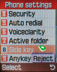 Duration of backlighting can be also different and a choice of various values is very broad (from 15 seconds to 10 minutes). The longest value is interesting for those who like to play games. In this case they will not have to move keys to activate backlighting while playing a game. There are up to 15 points of the screen brightness. A side button could serve as a Cancel key or change to silent mode (the device stops ringing). The function is interesting when an external screen presents and here it is optional. The handset has Voice Clarity - this is a preinstalled equalizer that improve the quality of speech in case of bad receiving. This option is worth activating, if you often have problems in connection and hear your interlocutor bad. You could activate it while talking as well.