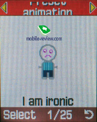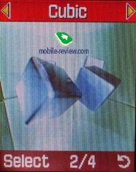 The device is equipped with an 800 mAh Li-Ion battery. According to the manufacturer, it is capable of providing about 3 hours of talk time and about 250 hours of standby time. In the condition of Moscow MTS network the device worked for about 4 days in case of 40 minutes of talks and the least use of other functions. Full recharging takes about 2 hours. MenuThe main menu is represented as thee icon rows. The handset has merely such representation of the menu and one may not select another one. Submenus are represented as vertical lists. A quick navigation using number sequences functions everywhere.
