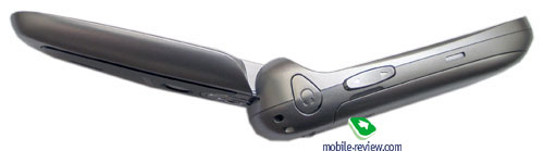 The handset dimensions are modest for the class (87x46x23 mm) and due to the rounded shape the device fits your hand well. The weight does not exceed any tolerable figures (85 g). One could not feel the handset in hand, though its mass is enough not to forget of it. The left side surface has a headset gap (a usual pin gap shielded with a plastic shutter) and a coupled volume button. On the bottom there is a standard interface connector. The right side surface has a button assigned to the camera. It is interesting that when the device folded, the camera runs as well - you should just press and hold down the button and the service indicator will blaze with even light that means availability. A further pressure permits you to photo yourself, peeping at the mirror.