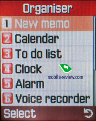 Organizer. You can easily add a new reminder (up to 100 characters). After inputting text, you could select one of the categories (Schedule, to-do list, call, anniversary). Depending on the selected category, different actions will be offered. For example, if you select a schedule, you will see a calendar, then select a day, indicate time, set alarm-clock. Then, this record will be saved and displayed in a separate window. Unlimited number of records could be added to one day, totally up to 25 records of each category are available. When you view several records added for one day, you could see the number of the current one. On the whole, the organizer is well-realised. ![]()
