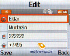 В телефоне два поля для имени и фамилии (поиск только по первому полю), при отображении поля суммируются, первым идет поле Имя. К примеру, Эльдар Муртазин показывается именно в такой последовательности. Длина каждого поля равна 20 символам, причем для любого из поддерживаемых языков ввода. Вы можете также чередовать различные языки при наборе имени. Сортировка записей на различных языках осуществляется по порядку: сначала все контакты на локальном языке (к примеру, русском), затем все имена на английском. Это достаточно удобно и привычно по компьютерным программам. Учитывая возможность быстрого переключения языка при поиске, становится ясно, что записи на различных языках не составляют проблемы в этом аппарате. Вернемся к заполнению имени; помимо телефонов, можно записать адрес электронной почты (их может быть несколько), небольшую текстовую заметку. Для имени возможен выбор любого звукового файла в качестве мелодии звонка, в том числе и мр3-композиции. Вы легко можете создать необходимое число групп, выбрать для каждой свою мелодию, картинку. Для SMS-сообщений также возможно указание своей мелодии звонка. В памяти телефона сохраняется до 1000 имен со всеми заполненными номерами и данными. Если заполнять не все поля, то число имен все равно останется равным тысяче. В настройках можно указать, куда по умолчанию будут записываться все новые номера. Есть настройка переноса записей из памяти SIM-карты, но не обратно. Разработчики посчитали, что наилучшим способом для синхронизации является ПК, в частности, использование MS Outlook. Любую запись можно быстро отправить на другое устройство как SMS/MMS, почтовое сообщение, а также через Bluetooth. Никаких трудностей с отправкой не возникает, запись телефонной книги уходит на другое устройство без проблем и точно так же распознается. В телефоне можно завести свою визитку, ее формат совпадает полностью с обычной записью телефонной книги. В списке быстрого набора может быть до 8 номеров, причем занести можно и отдельные номера одного имени. На кнопках появляется подпись в виде выбранного имени, но не типа телефона.