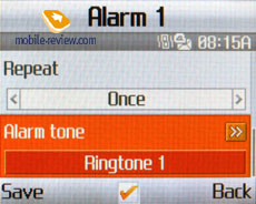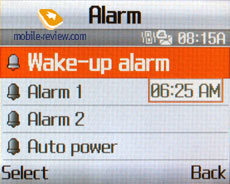 Будильник. В телефоне всего три будильника, один из них утренний, его можно выставить на определенные дни недели, впрочем, такая возможность есть и у двух оставшихся. Для каждого из будильников есть выбор из 5 мелодий, но можно использовать и мр3. В настройках можно указать, будет ли телефон включаться автоматически при наступлении события или нет.
