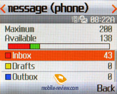 Сообщения. Работа с различными типами сообщений реализована из отдельных подменю. По традиции начнем с коротких сообщений. В памяти телефона может храниться до 200 сообщений, аппарат поддерживает стандарт EMS, совместим с Nokia Smart Messaging. Реализация Т9 не вызывает нареканий. При отправке можно выбрать имена как из телефонной книги, так и из списка последних использованных либо из групп. Традиционно присутствует возможность ведения черного списка для всех видов сообщений, тогда любые сообщения с указанных номеров будут автоматически удаляться. Есть возможность переносить сообщения в свои папки.