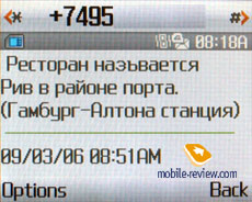 MMS. Интерфейс для создания мультимедийных сообщений приятен, их сразу же можно сохранять в различных папках. Существует ограничение на размер сообщения в 295 Кб, а размер принимаемого сообщения не ограничен. Из дополнительных настроек надо отметить возможность отклонения рекламных сообщений, выбор типа приема сообщения в роуминге и в домашней сети. Сообщения сохраняются в отдельной памяти в 3.7 Мб, она разделяется с сообщениями электронной почты.