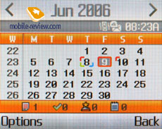 Органайзер. В памяти телефона можно сохранить до 400 событий (4х100), всего предусмотрено 4 их типа – встреча, дело, годовщина, другое. Для каждой записи устанавливается время и дата события и указывается время его окончания. Можно выставить сигнал и интервал, за который он сработает, есть повторяемые события (причем настраивается время повтора, указываются исключения, это удобно). Просмотр календаря за месяц и неделю реализован удобно, каждый тип событий имеет свой цвет, все наглядно.