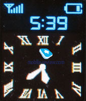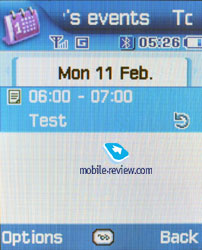 Organizer. Alarm clock. The phone is equipped with three alarm clocks. One is meant for mornings and can be set for selected weekdays as well as for weekends. For each of the alarm clocks there is a selection of five melodies although mp3 compositions cannot be used here. It is up to a user to indicate in the settings whether the phone would turn on automatically in the time of the event or not. ![]()