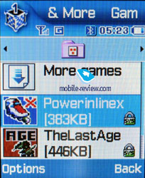 MMS. The interface for multimedia messages is very nice; the messages can be saved in several folders at once and right away. There are no size restrictions for a message to be received although an outgoing message should not exceed 295 KB. As for additional services, the rejection of advertising messages, the option of the message receipt in the roaming and the home network should be mentioned. The messages are saved in the general memory since there is no special memory for them. Mail client. POP3/SMTP boxes and several tracking files are supported. Besides the title downloading, the phone can receive the letter itself. As for attachments, only the graphic files (GIF, JPEG) are supported. When sending a letter, you can attach a picture from the integrated camera to it. Overall, the mail client is nice although it does not stand out with an immense number of functions. There is also an option of creating templates. Applications. Java World is the first menu item; up to four MB of memory are available in the phone for various programs. This is a separate memory allotment and is used for Java only. MIDP 2.0 version allows the use of the graphic reach and three-dimensional games. There are four games preinstalled in the phone - Bobby Carrot, Airship Racing, Freekick and Archangel. ![]()