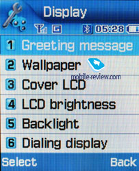 Settings. That is traditional that you are allowed to choose font colour in the standby mode, protect any section of the phone with a password (messages, short messages, organizer and so on). You may set the time for backlighting on and its brightness. ![]()