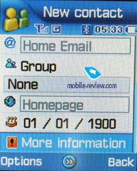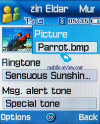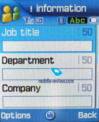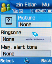 There are two fields for a Name and a Surname (search only by the first one) that are concatenated when displayed and the Name field goes the first. For example, if you entered Eldar Murtazin, it is displayed exactly in this manner. The length of each line is 20 symbols for any of the available languages. You may opt to alter the language while inserting the text as well. Files in different languages are sorted out according to a rule - first it will be all files in the local language (Russian, for example), and then those in English. This is rather convenient and habit forming. Taking into account an option of fast language change during the search, it becomes clear that the files in different languages do not impede the work with this phone. Let us return to the information entered for one name. Besides phone numbers, an e-mail address and a little text memo can be recorded. Any music file as well as composed MP3's can be chosen as a ring tone for the name. Three caller groups are preinstalled and out of any category. You can easily create a necessary number of groups, select a personal melody and image for each.