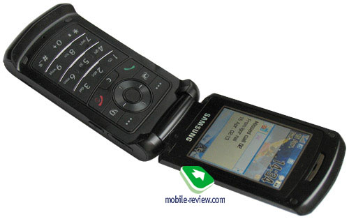 The main material, the casing is made of, is high-grade plastic, which provides excellent surface quality, hardly gets soiled and not exposed to wear and tear much. The shell itself is quite soft, but again, scratches become visible only after long period of usage. The front plate homes a 1.3 Mpix CMOS camera and the external display beneath it. The screen possesses a resolution of 128õ128 pixels (1.07 inches, 21õ21 mm), and is capable of reflecting up to 65 K colors (TFT). The screen can show up to 4 text lines at the same time, while the two service lines feature icons standing for various modes, and current time. In spite of many other models by Samsung, when at the standby screen the status bar is not active, but turned off. It seems this was done in order to reduce energy consumption. Should you place the device on the way of sunlight, the information will remain well-distinguishable. Of additional settings, possibilities of setting own wallpapers and choose among three types of digital and analog watches and a greeting message are noteworthy.