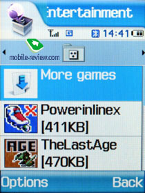 Java World. The phone has only 2 pre-installed games on-board – these are Powerinlinex, and The Last Age. Downloading of new applications and games is carried out only via wireless networks, at that size of a single JAR file cannot exceed the limit of 1 Mb. Though there are no caps on maximum amount of applications or storage, taken up by them. Each application may be adjusted to execute only certain actions.