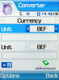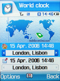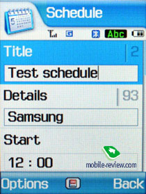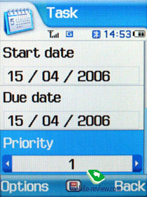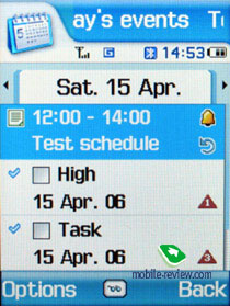 Organizer. Up to 100 events of four types - meeting, affair, anniversary and others - can be saved in the phone's memory. The day and the time as well as its end are indicated for each file. A signal can be set for the interval during which it has to go off; repeatable events are available for setting up (at that repetition time is also adjustable as well as exclusion dates). The weekly and the monthly calendar are very convenient with each type of the event having its own color.