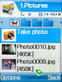 There are about 5 different sounds for the shutter, not counting the silent mode, when the process of taking photos won't draw everybody's attention. Default file name, the sensitivity of the matrix (Auto, ISO 100, ISO 200, ISO 400) are available for adjustment. I'd recommend using an Auto mode since it allows getting correct settings in majority of cases. The difference between sensitivity modes is quite hard to notice in normal conditions – in fact you won't see any changes on a real photo. The timer for self shooting is set for 3, 5 or 10 seconds. The mosaic mode switches the camera to the lowest resolution (a final picture is 640 x 480 pixels) and you get a picture that consists of 4 or 9 items (2x2 or 3x3). A feature of some interest should you be willing to carry out some experiments. In the multi shot mode it's possible to select some series, in particular that may be 6 photos with high speed (practically immediate pictures), with normal speed (the period between the photos is a second or less). Also modes with 9 and 15 photos are available. I'll note that the function is interesting as a photofinish at a competition, in real life if moving the camera the photos will get blurry in the majority of cases. The resolution is 320x240 in this mode. Describing separate functions, we completely forgot to tell about switching into the shooting mode, which is done either by pressing the side button or via the menu. The screen of the phone serves as a viewfinder, using the navigation button you may change the contrast level and use zoom. When the resolution reaches the maximum level, zoom turns off automatically. The picture may be mirrored on the screen using side buttons.