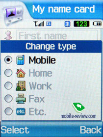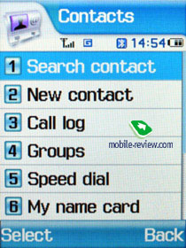 Phonebook. By pressing the navigation key down, one can obtain the contacts in a form of a list containing all the files both from the phone's and the SIM-card memory. The first name in the list is backlit by default and the number is shown in the status bar (there is a special sign for numbers from a SIM-card). There is a fast search by first letters of a name; the phone can hold more than twenty of those for any possible language. By pressing the OK key, you enter in the view menu of a single file where you may see a small icon in case the name is matched with the image. Any graphic file or the pictures of your own may be used as such image. Up to five phone numbers of various types (cell, office, home, fax, other) may be kept for a contact with one number assigned as the main one (by default the first entered number). The data fields are not strictly fixed, so that you can create two mobile numbers, or even five – everything is up to you. Of extra fields, there are birthday, which may serve as a reminder; text note, nickname, department and company data fields.