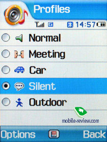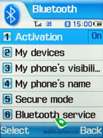 Bluetooth. The handset supports various profiles, namely, Headset, Handsfree, Serial Port, Dial Up Networking, File Transfer, Object Push, and A/V Headset. The Bluetooth realization is not ideal, often troubles with headsets having only a Headset profile appear, and work with a speakerphone is also incorrect sometimes. In general the Bluetooth is better than in Nokia phones, Siemens, but worse than in Sony Ericsson.