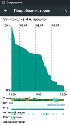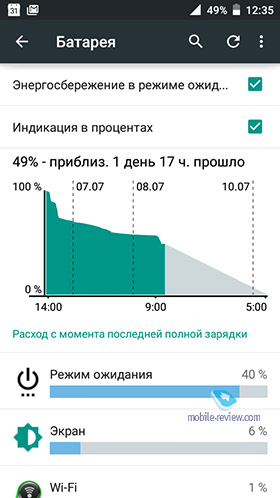 Заявленное время работы в режиме ожидания – до 800 часов, в режиме разговора – до 10.5 часов. Интереснее, что получается на практике, ведь обычно идеальные характеристики очень далеки от реальных. Вот, что в среднем выходило при моем профиле использования – 4-4.5 часа работы экрана при 2-2.5 днях работы телефона. Подсветка экрана чуть больше половины яркости, работает передача данных 3G, а также Wi-Fi там, где он есть.