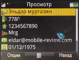 Телефонная книга. Объем памяти телефона составляет 250 контактов. Для каждого абонента можно внести четыре телефонных номера (Number, Home Number, Office Number, Fax Number), имя компании, адрес электронной почты, дату рождения. В настройках можно отключать отображение всех полей, кроме имени и номера телефона. Запись можно сохранить, введя только имя абонента. Первый номер становится номером по умолчанию, он же будет использован как номер абонента для быстрого набора. Для того, чтобы позвонить по другому номеру, вам придется зайти в Опции, выбрать желаемое действие (в данном случае IP-набор – это вызов абонента) и уже после этого выбрать из списка желаемый номер. На звонок контакта можно присвоить картинку (не более 20 КБ) либо видео из памяти телефона или с карты памяти, причем видео обладает более высоким приоритетом. На запись в адресной книге можно назначить одну из пяти своих мелодий (ограничение платформы) как из памяти аппарата, так и с карты памяти. Также производитель предустанавливает стандартные мелодии вызова, их количество зависит от конкретной модели телефона. Абонента можно внести в одну из пяти групп (Friends, Family, VIP, Business, Other) или же не вносить ни в одну из групп (None). Добавить новые группы нельзя, но можно скорректировать название имеющихся. Так же, как и на контакты, на группу можно поставить мелодию, изображение или видео. Записи в телефонной книге отображаются как из памяти самого аппарата, так и из сим-карты. Они могут дублироваться как на сим-карте, так и в памяти аппарата, ограничиваясь лишь памятью. Поиск по телефонной книге можно осуществить двумя способами: из самой адресной книги по пяти буквам или из пункта «Поиск» (Search Entry) по десяти буквам.