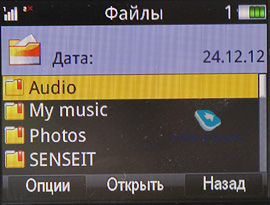 Файл-менеджер. На стартовой картинке вы видите диаграмму о свободном и занятом пространстве памяти телефона либо карты памяти. В верхней части экрана выводится служебная информация о выделенном объекте: для папки – дата создания, а для файла – дата создания и размер. При наведении курсора на изображение тут же выводится его эскиз. Телефон распределяет файлы медиа по папкам. Так, видеофайл, записанный на телефоне, будет размещен в папке Video. То же самое касается музыки, рингтонов. Это связано с ограничением платформы: аудиоплеер, так же, как и видеоплеер, не имеет доступа ко всей файловой системе, а только к конкретным папкам в телефоне и на карте памяти. Файл-менеджер обеспечивает базовую на сегодняшний день функциональность: сортировка папок и файлов по типу, имени или размеру, создание, переименование, удаление папок. Файлы можно перемещать между папками, передавать их на другие устройства через Bluetooth, E-Mail. Копировать и перемещать папки файловый менеджер не может.