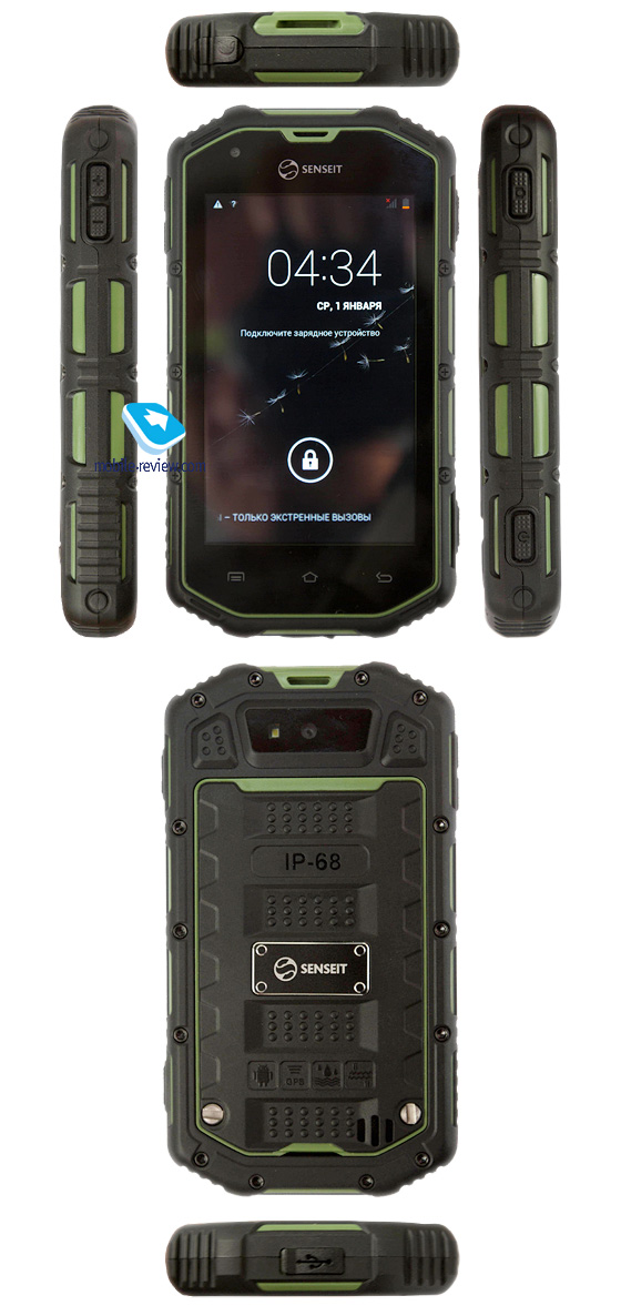 ПозиционированиеПредложение в сегменте защищенных смартфонов не отличается разнообразием – как правило, это модели прошлых сезонов с маленькой диагональю экрана, высокой стоимостью. Тем, кто ищет не просто модель стандарта IP67/IP68, а нечто обладающее реальной защитой от падений, жесткого обращения, фактически нечего выбирать. Серийные модели флагманов обладают защитой от воды – таковы Galaxy S5/S5 Mini, Sony Xperia Z2 и ряд других. Но защита от ударов у них весьма условная, экран является хрупким местом. К сожалению, в мире не так много производителей, ориентирующихся на этот сегмент. Все, что выходит в течение года, можно пересчитать по пальцам руки, жизненный цикл моделей составляет несколько лет, что делает их начинку устаревшей с точки зрения массового рынка еще до момента, когда они начнут продаваться. С другой стороны, применение подобных смартфонов очень специфично – например, модели, аналогичные Senseit R390, используются враждебными сторонами в конфликте на Украине, там нужна связь и дополнительная прочность. Не уверен, что прочности такого аппарата хватит, чтобы выжить при взрыве (это не стандарт MIL810G), но он явно выигрывает у своих серийных собратьев и обеспечивает связь. Возможно, что именно этим обусловлена популярность этих аппаратов сегодня, мы наблюдаем всплеск их продаж как в России, так и на Украине. Он сильно отличается от предыдущих лет, когда подобные телефоны продавались в сезон неплохо, но скачкообразного роста спроса не было. Если убрать за скобки неожиданную аудиторию, которая появилась у таких защищенных аппаратов, то остаются все те, кто хочет получить смартфон и возможность установки дополнительных приложений (навигация, геометки и так далее плюс современные мессенджеры). Как правило, это люди, предпочитающие активный отдых, походы, плюс рыбаки. Вряд ли вы купите такой аппарат на каждый день, но как защищенный вариант телефона, в том числе и для пляжа, эта модель очень неплохо подойдет для многих. Дизайн, размеры, управляющие элементыАппарат выпускается в двух цветовых решениях – черном с зеленым, а также традиционном оранжевом с черным.