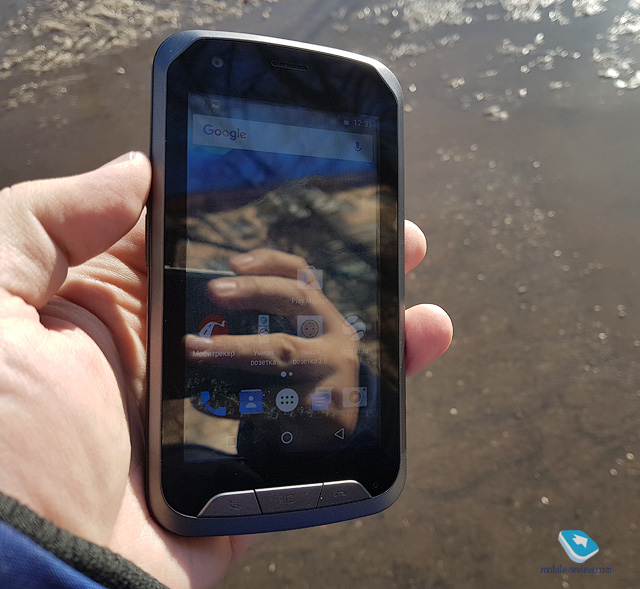 ДисплейУ подобных телефонов всегда небольшие экраны и низкое разрешение, у этого стоит дисплей в 4.5 дюйма с разрешением 480х854 точки, IPS, 217 ppi, есть датчик освещенности. Экран по всем характеристикам сильно уступает современным моделям, но для этого аппарата выглядит типично, в данном сегменте это норма. На солнце он бликует, но остается читаемым. Работа в перчатках с экраном не предусмотрена, что также типично для таких защищенных моделей. Если подходить к оценке экрана по меркам обычных смартфонов, то он однозначно проиграет. Но на рынке защищенных телефонов это неплохой экран, что лишний раз доказывает пропасть между этими двумя сегментами.