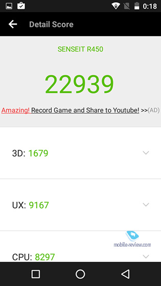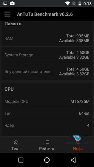 Память, платформа, производительностьАппарат построен на платформе MediaTek MT6735M (4 ядра до 1 ГГц, графический сопроцессор Mali T720), это четырехъядерный процессор с частотой до 1 ГГц, его нельзя назвать сверхпроизводительным, но для такого экрана его вполне хватает, а главное, он экономичен и дает долгое время работы. Любители виртуальных попугаев могут посмотреть на результаты тестов.