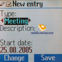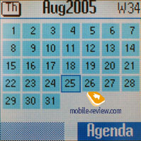 В календаре возможен просмотр за месяц или списка всех событий. Для события можно выбрать тип, это: заметки, вызов, встреча, день рождение и годовщина. В зависимости от типа события меняются и поле ввода информации (описание, номер или имя). Для событий можно выставлять повтор (ежедневно, еженедельно, ежемесячно или ежегодно). Есть список пропущенных напоминаний.