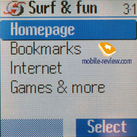 Интернет и игры. В данном разделе располагается WAP браузер версии 1.2.1. Также телефон поддерживает работу с Java приложениями, они устанавливаются в общую память. Загрузить Java приложение можно как через WAP, так и через ИК-порт и USB-кабель.