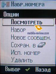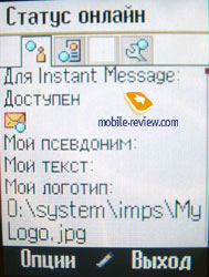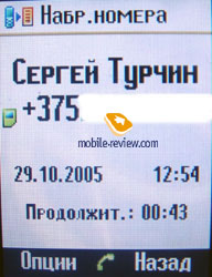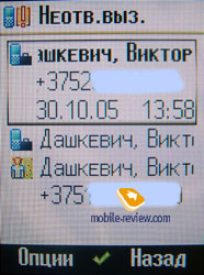 «Статус on-line» предполагает установки для обмена мгновенными сообщениями (аналог ICQ) после идентификации на внешнем сервере. В общем списке показываются все номера из памяти телефона и SIM-карты. Первыми выводятся записи латинским шрифтом, причем по умолчанию начиная с поля «Last name» (фамилии). Порядок сортировки можно изменить и тогда записи будут выводиться по алфавитному списку имен или по компании. За ними идут надписи на выбранном языке меню. Количество символов у записи не существенно при наведении курсора она прокручивается. Каждая запись в книге снабжена иконкой принадлежности к памяти телефона или карте SIM. В телефонной книге предусмотрено 10 групп, Добавлять новые группы нельзя, можно лишь переименовать имеющиеся. На каждую группу можно установить общую мелодию и картинку. При входящем звонке картинка выводится не на весь экран, занимая примерно лишь четверть доступной площади. По официальной информации емкость телефонной книги составляет 1000 контактов. На каждый контакт можно записать 4 номера телефона, присвоить мелодию, картинку или видеофайл, адрес электронной почты, адрес сайта, просто почтовый адрес, номер факса. При установке на контакт видеофайла на экране он не отображался. Рамка изображения на экране появляется, но остается черной и неактивной. Происходит это вероятнее всего из-за программной ошибки. Контакт можно поместить в одну из имеющихся групп, отметить день рождения – при этом запись будет автоматически занесен в календарь, сделать короткую текстовую заметку. В общем списке против записи контакта отображается только один телефон. Остальные доступны при открытии записи. Фотография в общем списке против имени тоже не отображается. Если по умолчанию для хранения фото выбрана карта памяти, то при ее удалении картинка не выводится. Стоит хранить файлы в памяти телефона тем более, что картинки для фотоиндикации звонка много места не занимают. При входящем звонке на экране телефона в виде иконки отображается тип номера, при условии, что он внесен в адресную книгу. Телефонная книга располагает собственными настройками, причем весьма разнообразными. Помимо уже упомянутого порядка вывода имен в списке, можно настроить вывод абонентов по псевдониму, включить сохранение неизвестных номеров. Записи в телефонную книгу можно импортировать по ИК-порту и Bluetooth. Настраиваются также параметры синхронизации. Ненужные опции можно просто отключить. Список вызовов состоит из неотвеченных, принятых и набранных номеров. Каждая запись выводится с указанием времени и продолжительности звонка, одинаковые записи в один пункт не объединяются. Список вызовов имеет не менее 100 позиций по каждому пункту журнала. Любой номер можно занести в телефонный справочник.